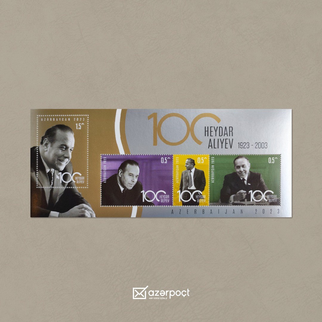 ”Heydar Aliyev 100 years”• Date of issue: 01.12.2023• Catalogue numbers: 1842-1845• Souvenir sheet of 4 stamps (1.50 AZN, 0.50 AZN)• Offset lithography. Gummed paper,105g/m2.• Size of souvenir sheet: 190x79 mm• Size of stamp: 52x37 mm, 26x37 mm• Round hole perforation• Designer: Orkhan Garayev• Printed by Bobruisk Integrated Printing House, Bobruisk, Belarus• Circulation: 4000 souvenir sheets• FDC: 200